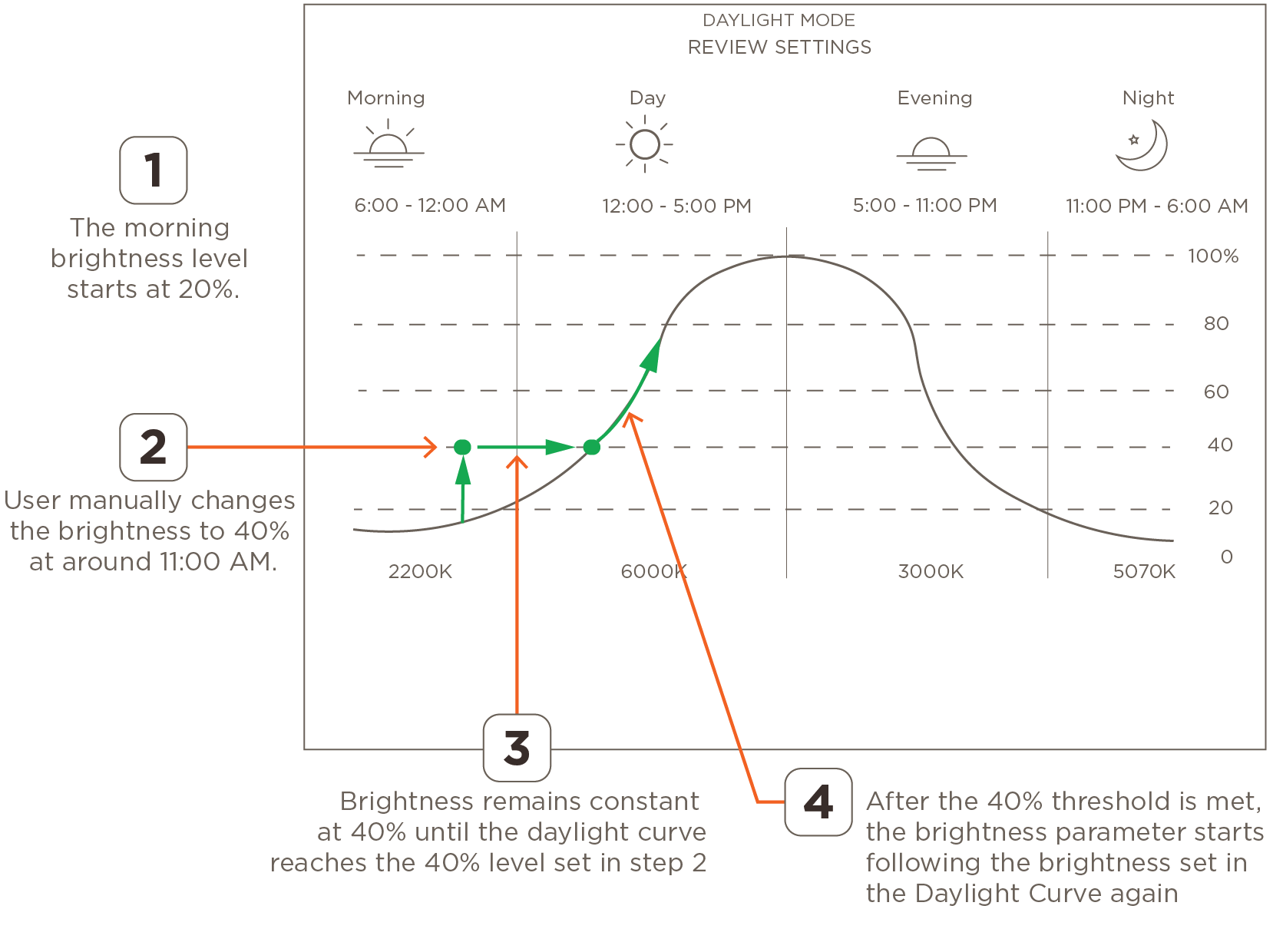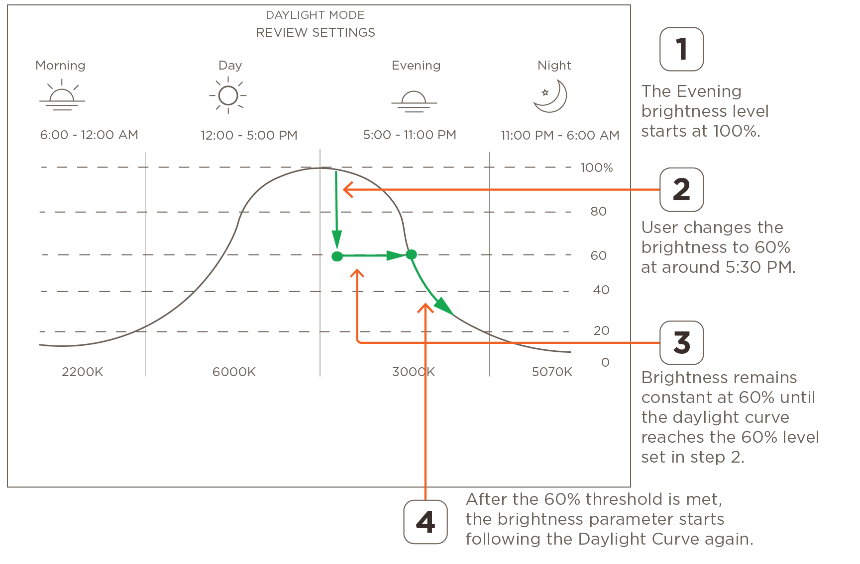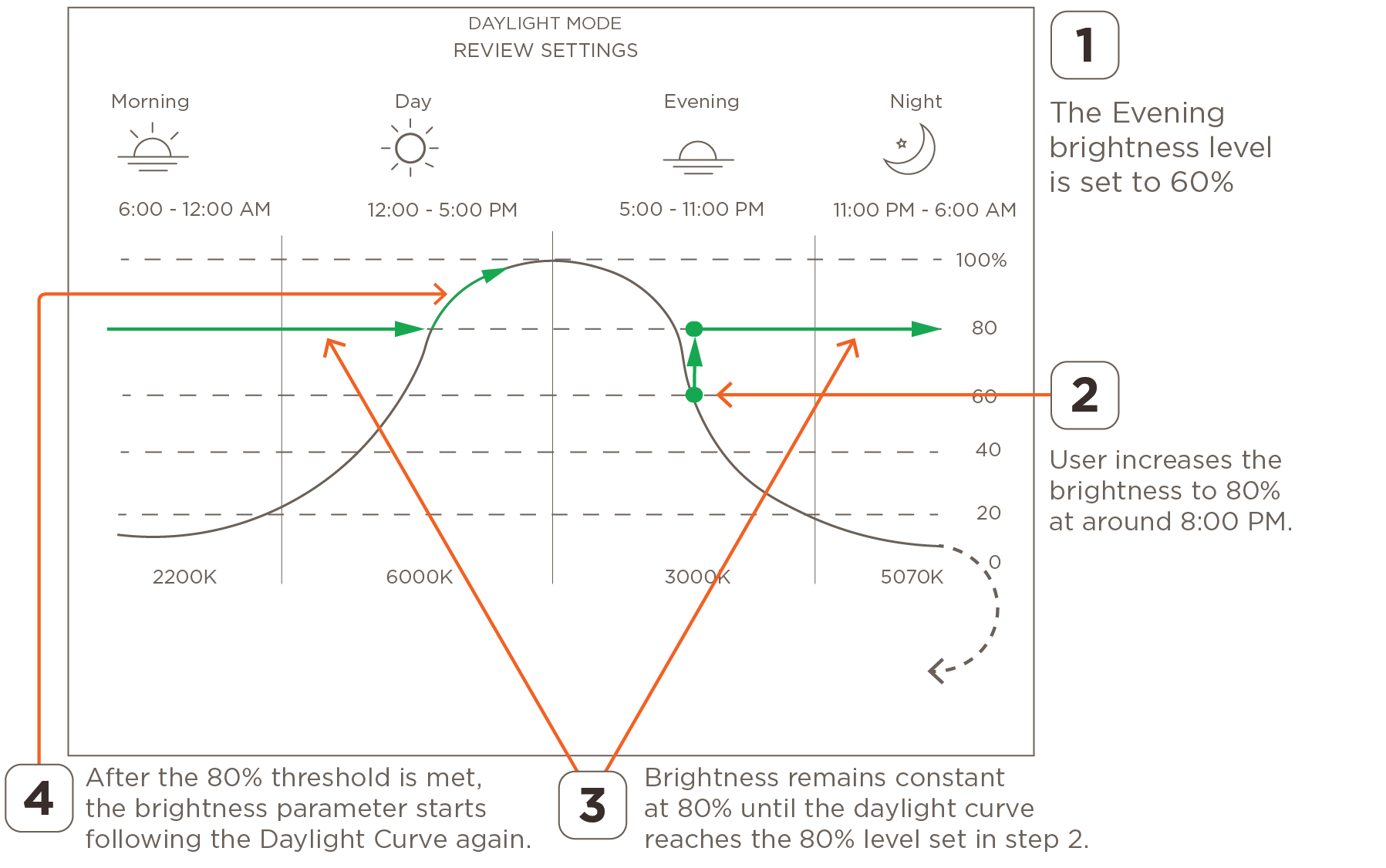 - After changes are made to the brightness of any light, the updated level of brightness remains constant until the level set in the Daylight Mode curve exceeds the manually changed level. This occurs whether the changes made are higher or lower than the brightness set in the curve. Below are a few examples: