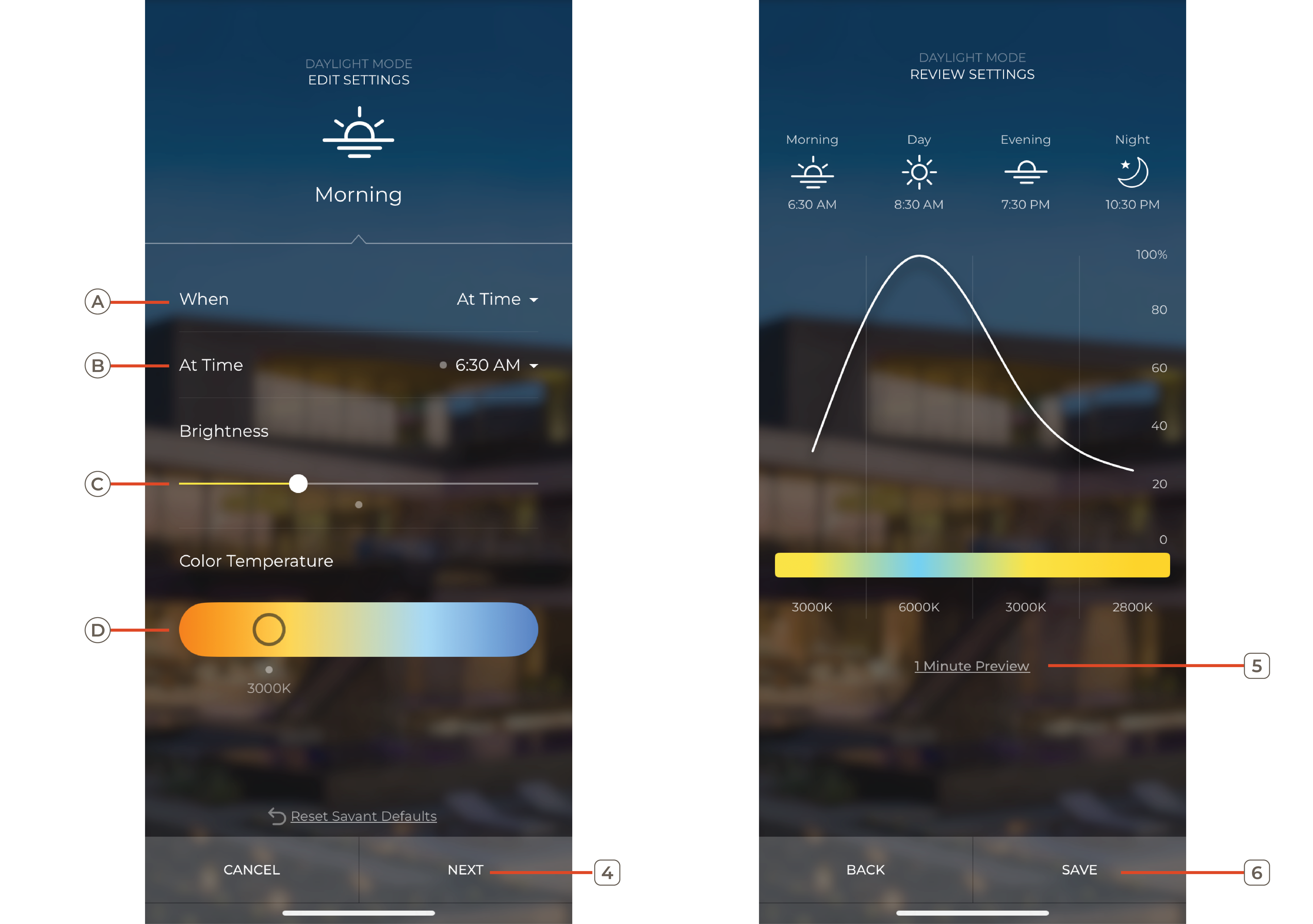 - The process leads the user through four separate screens (Morning, Day, Evening, and Night) and allows the user to set the brightness and temperature for each light at different times of the day. Tap Next when each phase is complete.