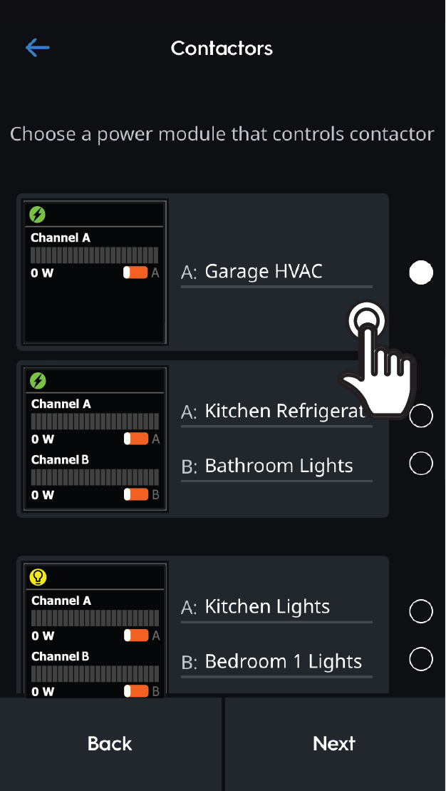 ![]() | 2 | Tap the power module that controls the contractor and tap Next. |