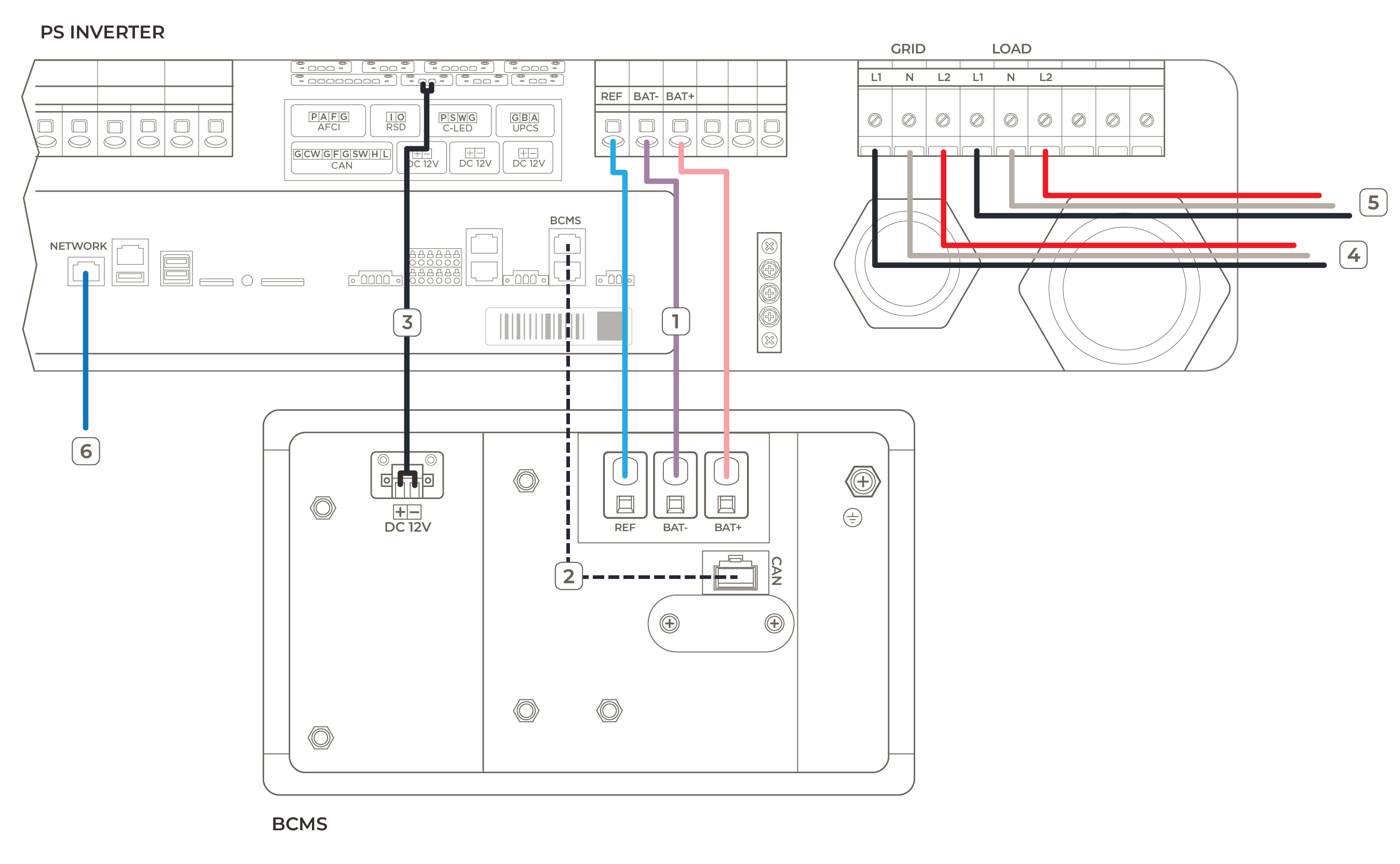 - Connect the BCMS Output ports to the inverter battery terminals.